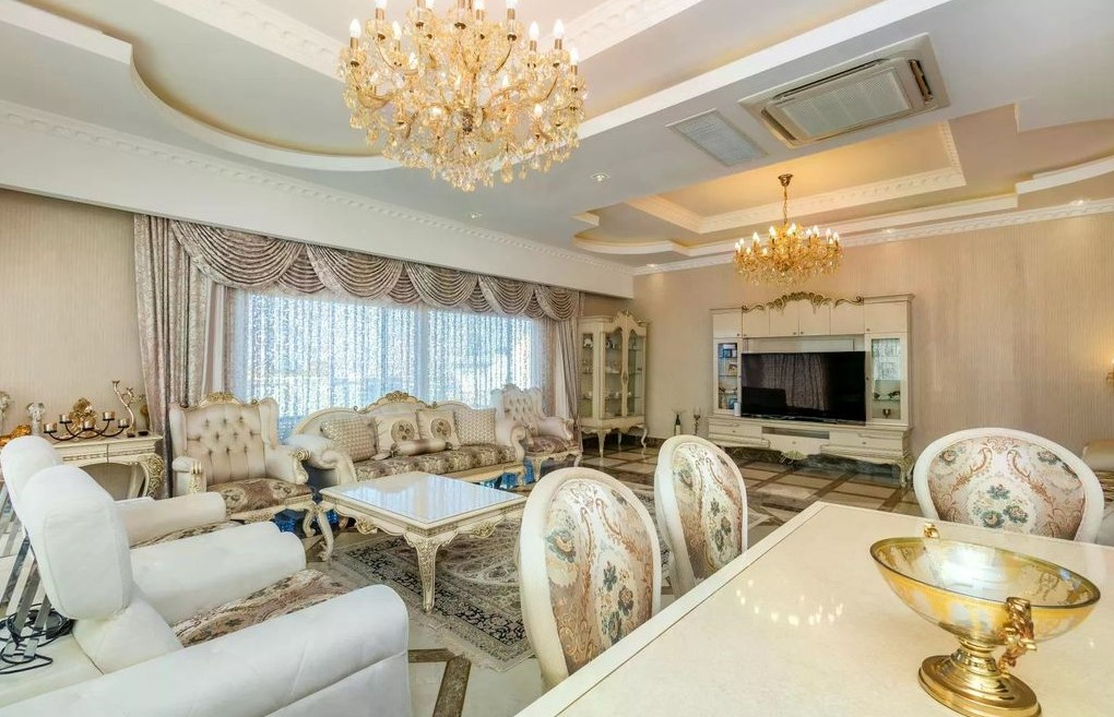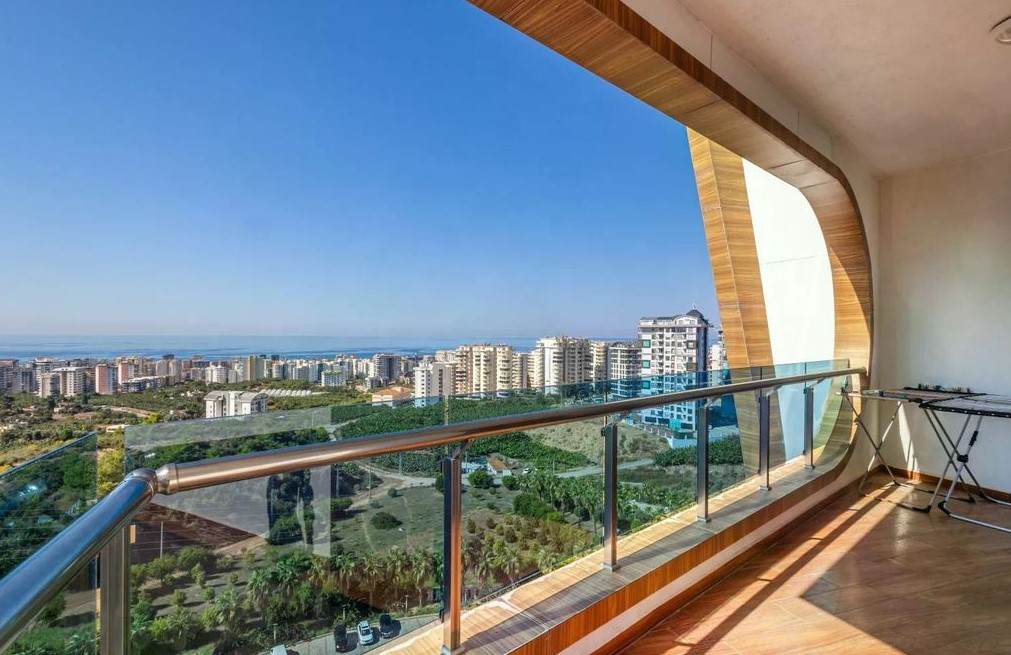 A 3+1 duplex apartment with an area of 354 m², located in one of the most elite complexes, Azura Park, in the Mahmutlar area of Alanya, is up for sale. The apartment has an excellent infrastructure with 3 bedrooms, a large living room, a spacious kitchen, 3 bathrooms, a sauna, 3 balconies, and a large terrace. The apartment is located on the 13th floor of a 14-story building and is equipped with panoramic windows offering stunning views of the mountains and the sea.